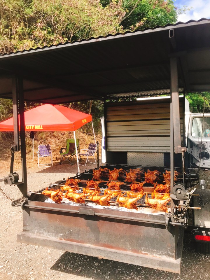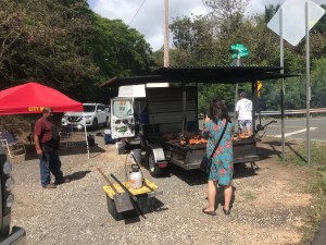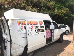 I’m always intrigued by roadside food stands but never stopped until today, when I caught sight of golden chickens rotating over an open rotissierie on a trailer hitched to van on the corner of Kalaniana’ole Highway and Old Kalanianaole Road as Waimanalo turns into Kailua.